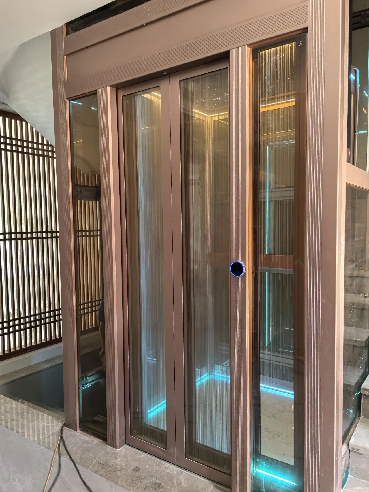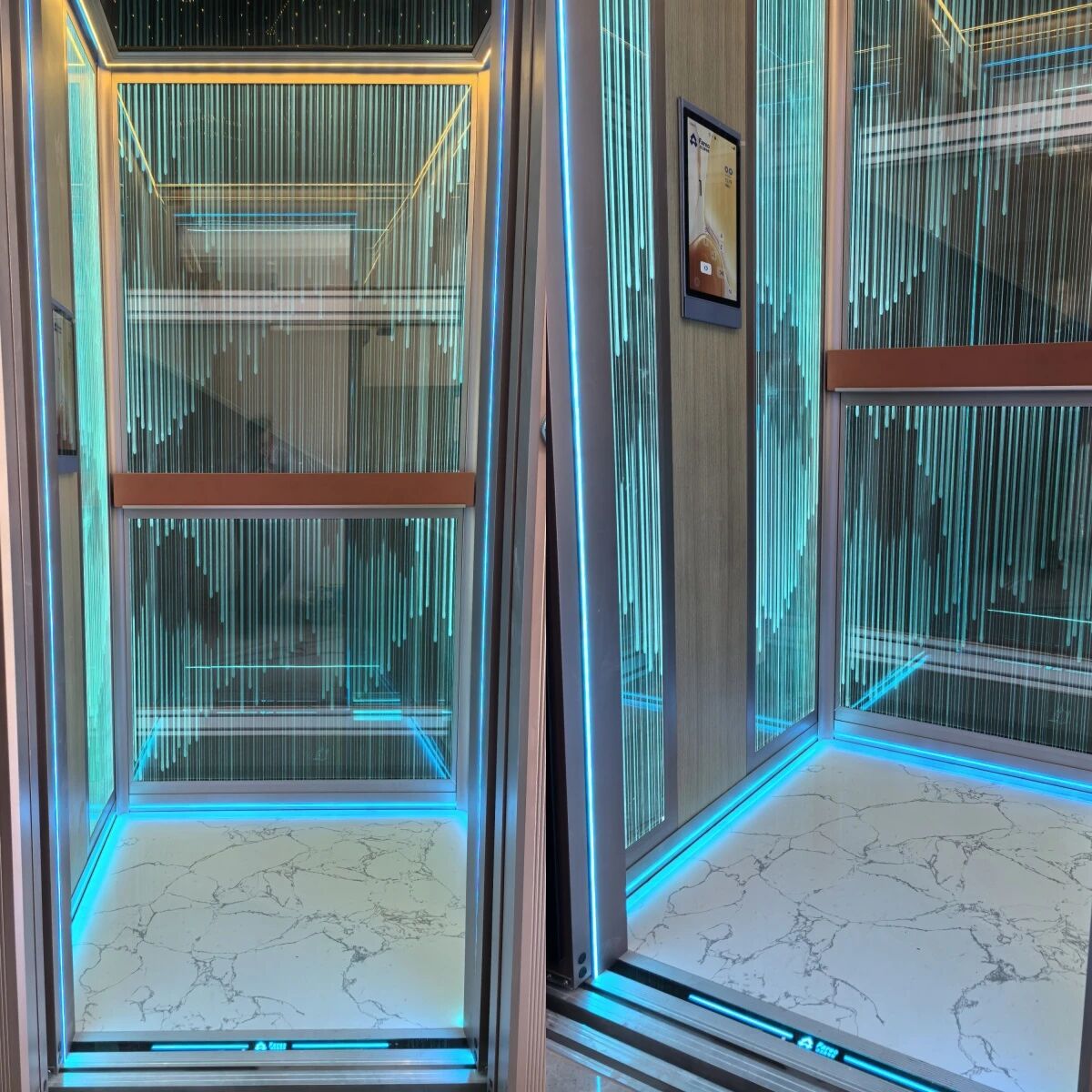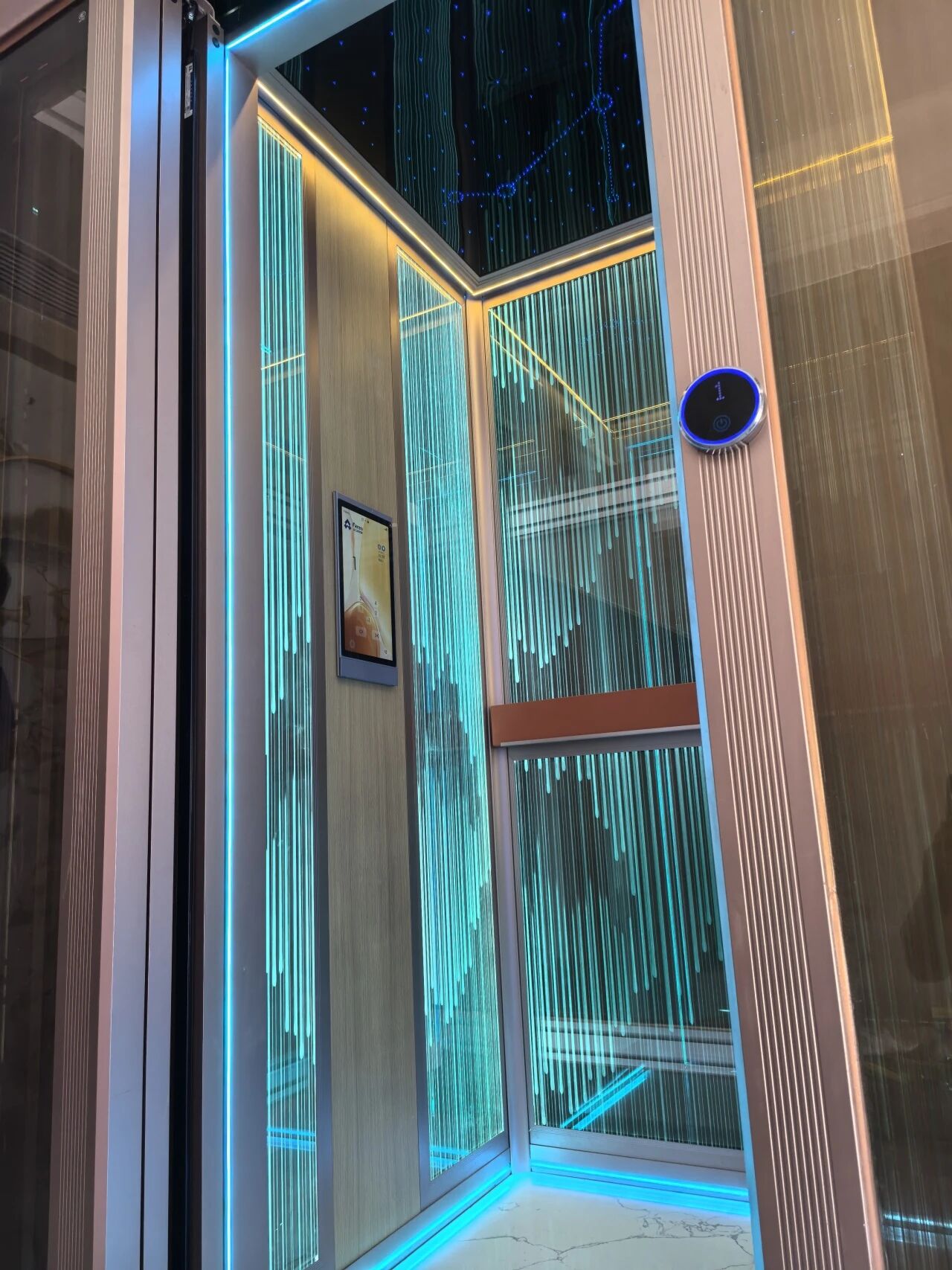 法立奥深耕高端定制领域,始终秉持“让美好生活上下延伸”的使命,其打造的现代简约别墅电梯,将科技感与艺术性完美融入居家场景。以江西赣州别墅项目为例,这款现代风格别墅电梯选法立奥的优势展现得淋漓尽致。电梯轿厢采用透明玻璃墙面搭配垂直蓝色光条,通透的空间感搭配未来感十足的光影设计,让每一次升降都成为沉浸式的美学体验。蓝绿色LED灯带沿轿厢轮廓延展,宛如星河环绕,夜间自动感应亮起的科技蓝氛围灯,为归人点亮回家的温馨之路。